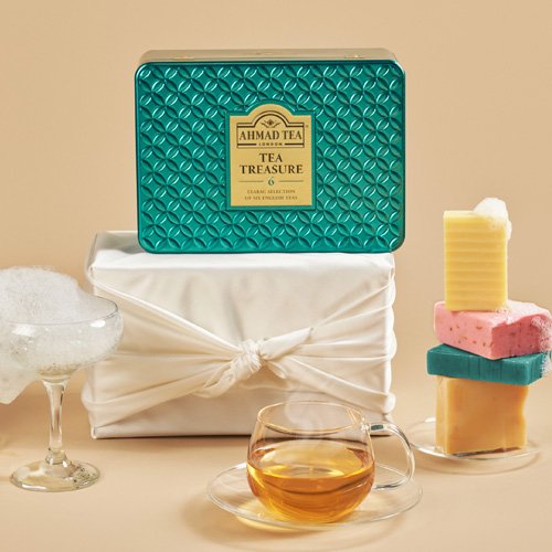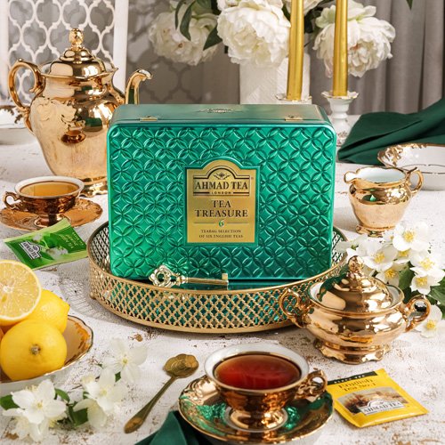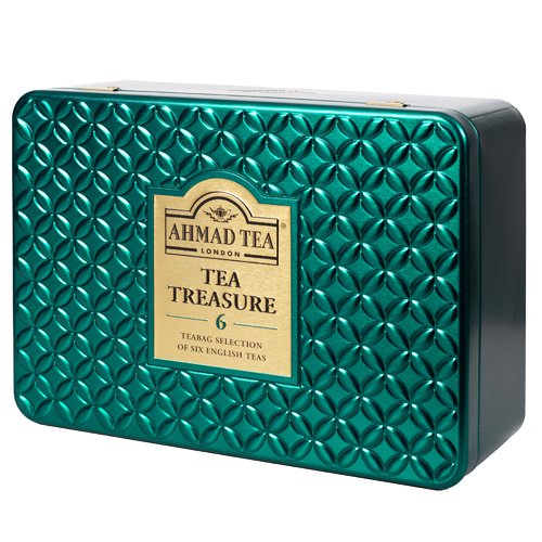 Dāvanu komplekts ar 6 dažādām tējām metālā kārbiņa : Melnā tēja English No 1, Grāfa Greja tēja, Angļu brokastu tēja, Zaļā tēja, Zaļā tēja ar piparmētru, Zaļā tēja ar jasmīnu. Vienreiz lietojami maisiņi ar aukliņām individuālā folijas iepakojumā. Uzlējumu izturēt 3-5 minūtes